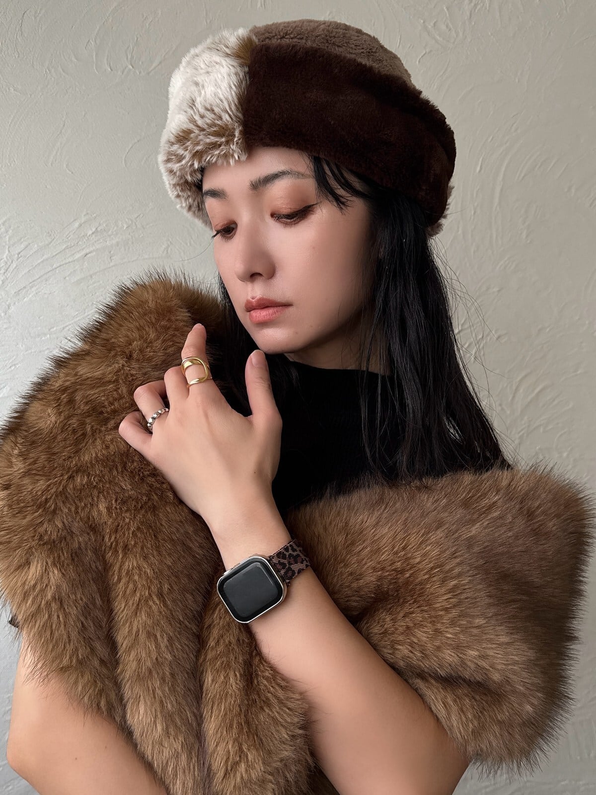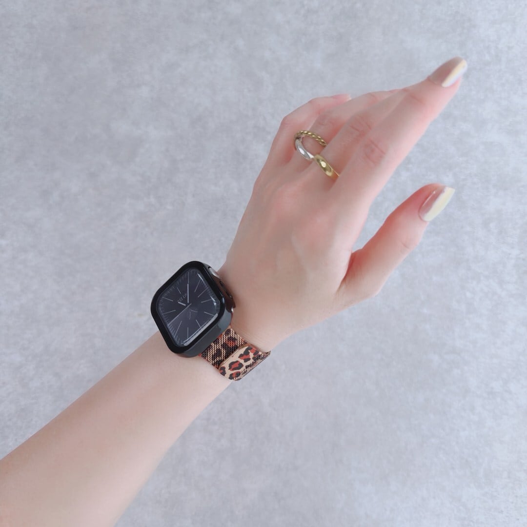 シンプルなコーデを引き立てる華やかなレオパード柄バンド。